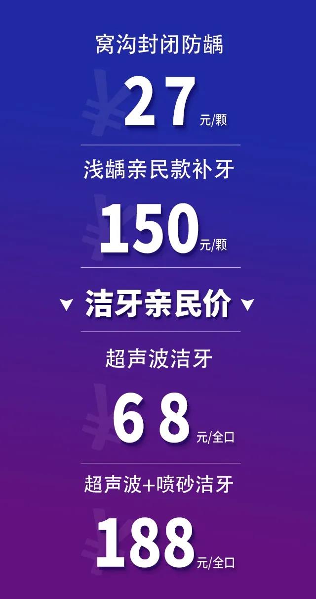 3、亲民价洁牙: 牙周病易防难治,洁牙是防治牙周病的重要方法,天使亲民价为:超声波洁牙68元/口;超声波+喷砂洁牙188元/口。